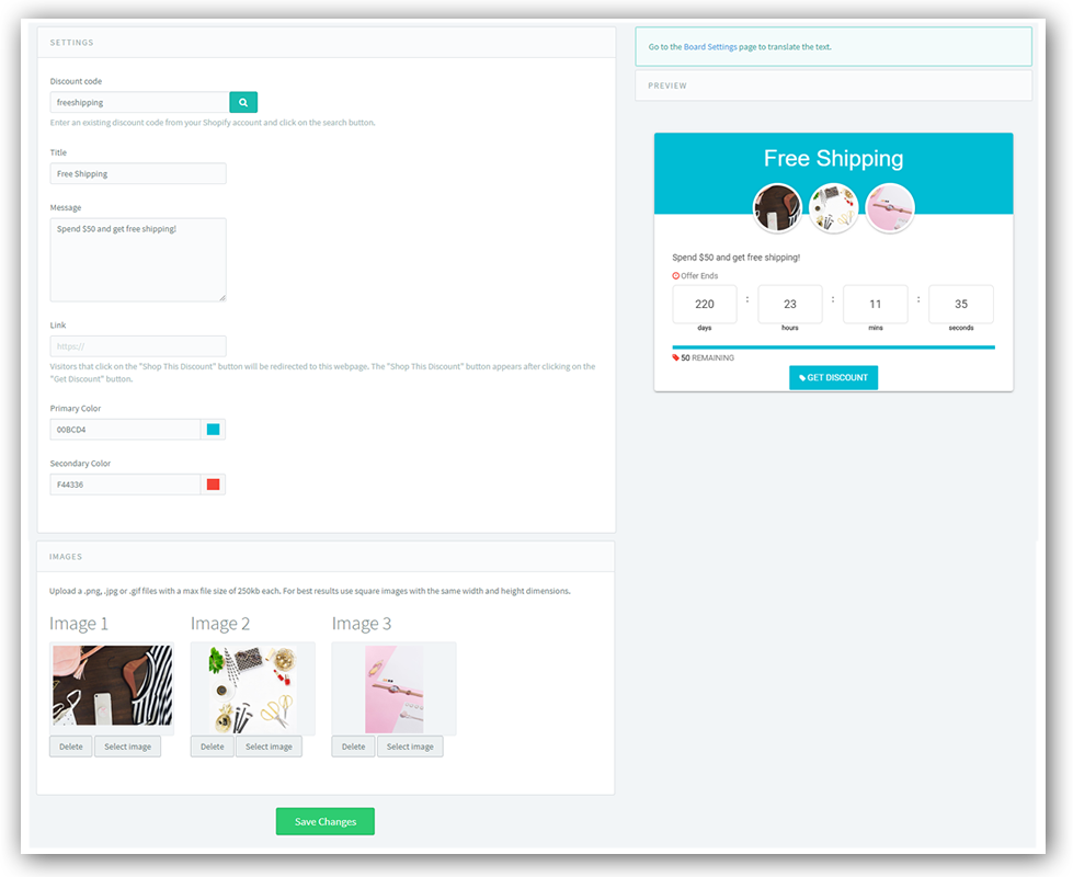 With Discount Display you can fully translate all of the text and colors. Easily update product images to make your discount board truly stand out. Need even more customization? Use the Custom CSS feature that’s available on the Premium plan for endless control.