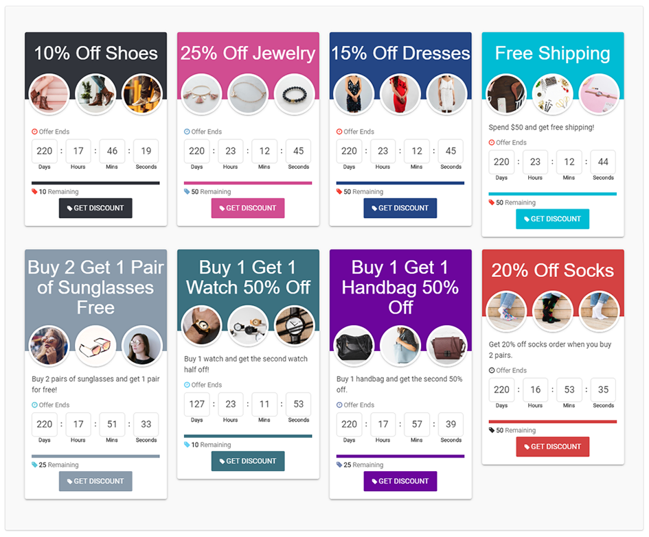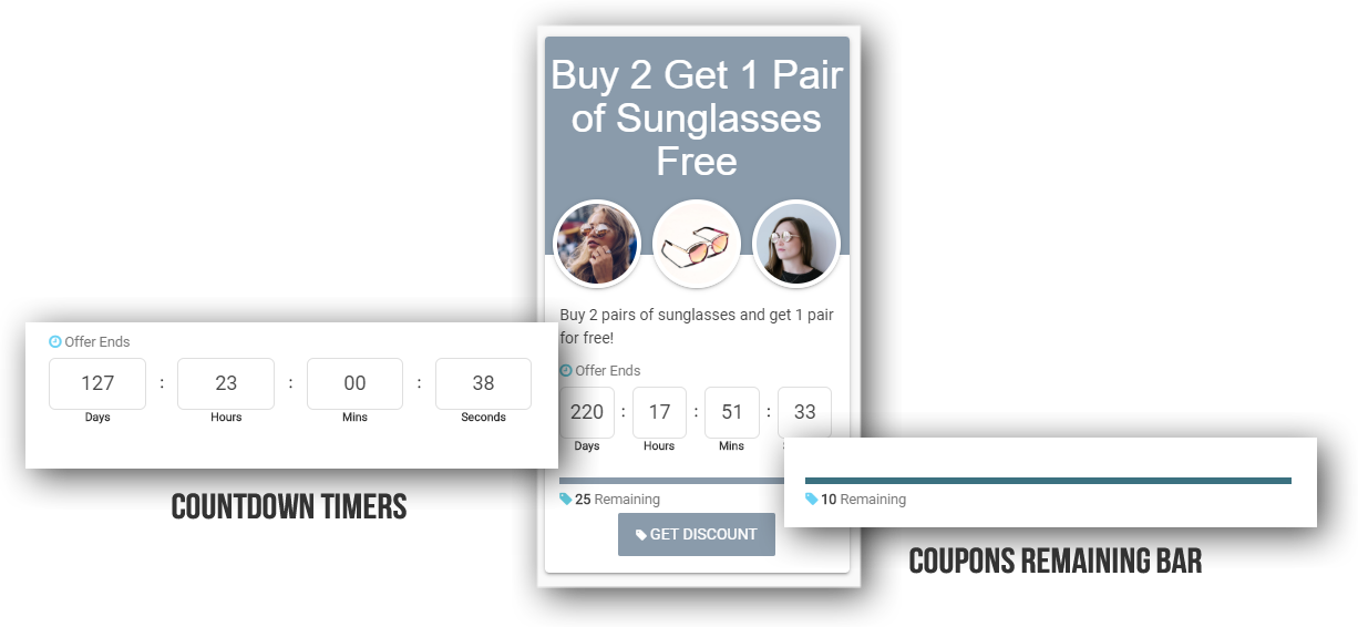 Add countdown timers and remaining coupon code progress bars to your discount dashboard to create urgency and generate more sales.